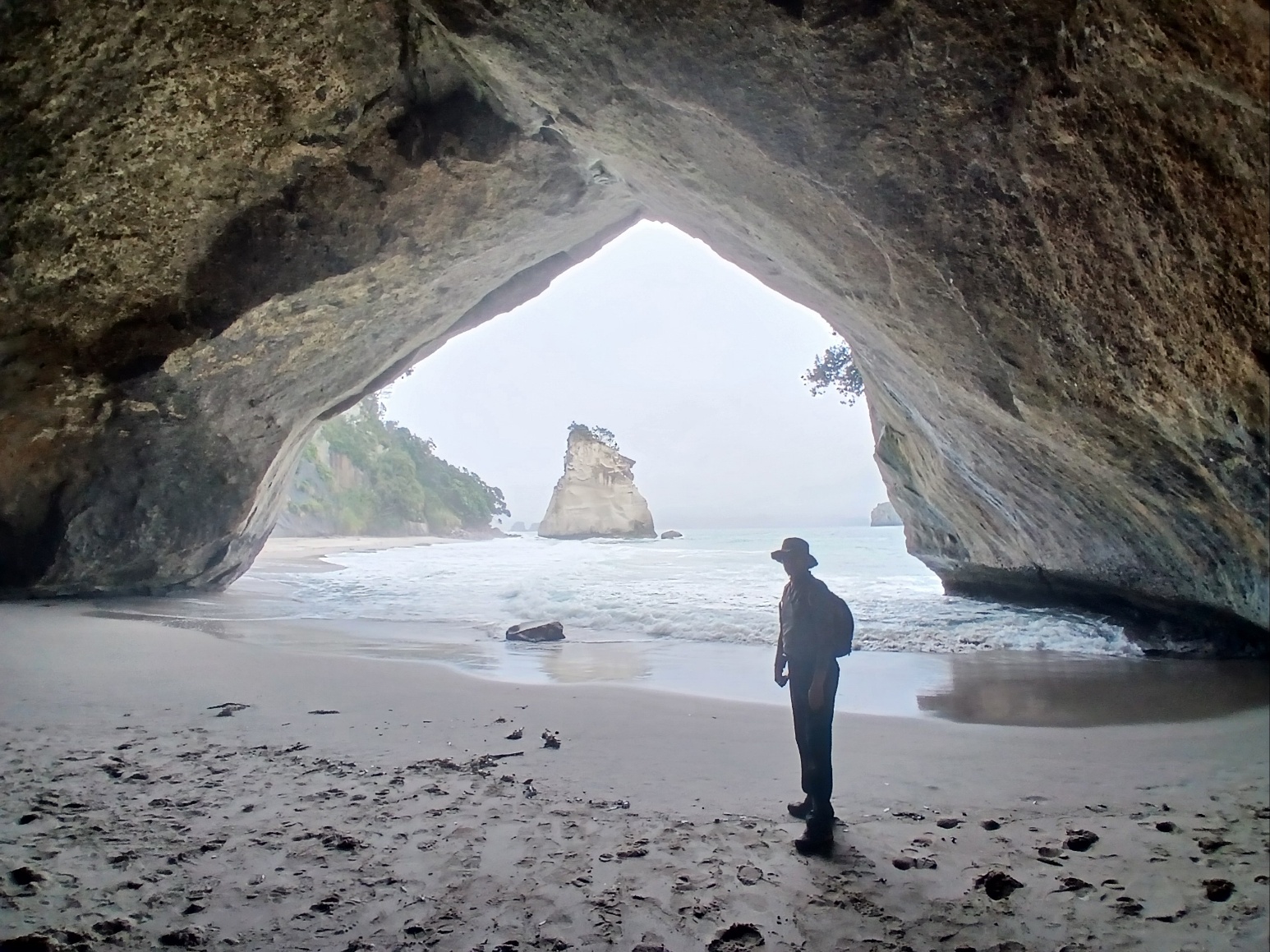 해안으로 내려오는 계단을 내려오면 왼쪽으로 삼각 아치 모양을 한 동굴이 있고, 앞의 해변에는 흰색의 시스택, 오른쪽 끝 해식절벽에는 폭포가 내려오고 있었다